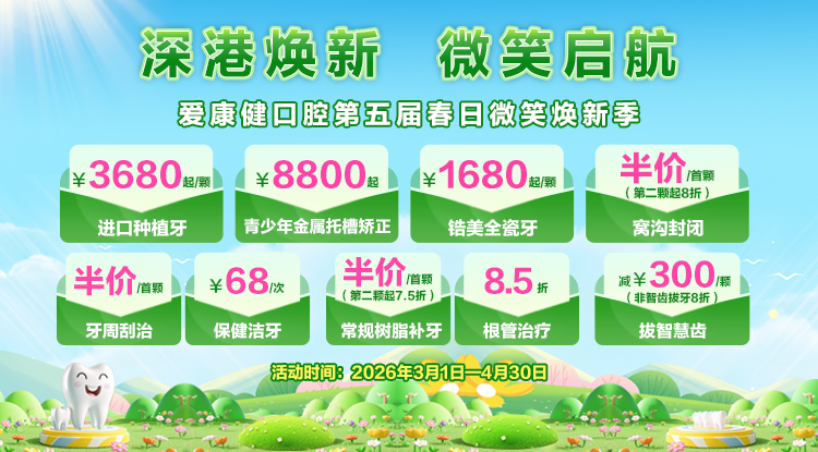 爱康健口腔始终把医疗质量、医疗服务放在shou位,配备诊疗设备,quan面开展微创种植牙、美学正畸、口腔修复、儿童牙科、牙病治疗等项目,专注呵护粤港市民的口腔健康!